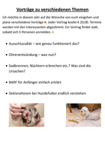 Beratungen hinsichtlich Erkrankungen Ihres Hundes, zur Erstellungen eines individuellen Futterplanes etc. sind kostenpflichtig und decken nicht den Rahmen einer Kaufberatung ab. Hierfür bitten wir um Verständnis.